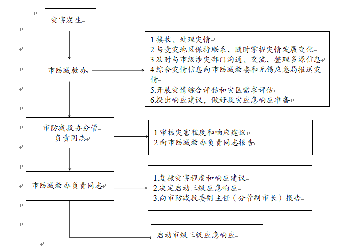災(zāi)害發(fā)生后,市防減救辦經(jīng)分析評估,認(rèn)定災(zāi)情達(dá)到啟動(dòng)條件,向市防減救辦主要負(fù)責(zé)同志提出啟動(dòng)三級響應(yīng)的建議。市防減救辦主要負(fù)責(zé)同志決定啟動(dòng)三級響應(yīng),并向市防減救委副主任報(bào)告。啟動(dòng)市級三級應(yīng)急響應(yīng)按照以下流程進(jìn)行: