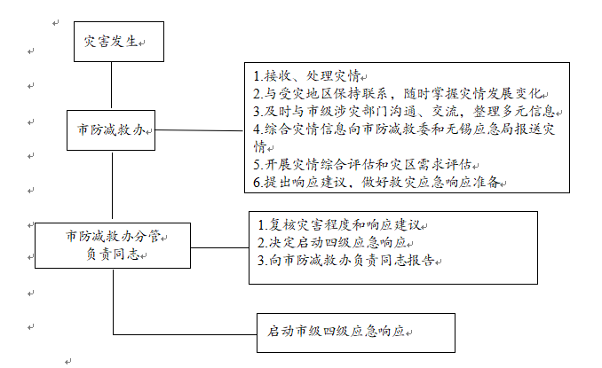 災(zāi)害發(fā)生后,市防減救辦經(jīng)分析評估,認(rèn)定災(zāi)情達(dá)到啟動(dòng)條件,市防減救辦分管負(fù)責(zé)同志決定啟動(dòng)四級響應(yīng),并向市防減救辦負(fù)責(zé)同志報(bào)告。啟動(dòng)市級四級應(yīng)急響應(yīng)按照以下流程進(jìn)行: