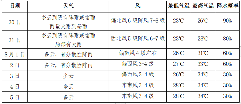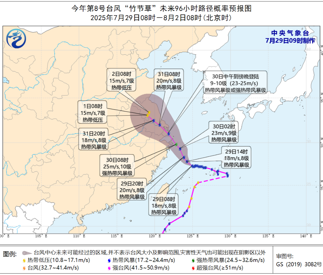 | 臺風“竹節(jié)草” 將攜風雨而來 今年第8號臺風“竹節(jié)草”(熱帶風暴級)中心位于距離浙江省舟山市東南方向約385公里的東海南部海面上(北緯27.3度、東經(jīng)124.7度),中心附近最大風力為8級(18米/秒),中心最低氣壓為992百帕。預計“竹節(jié)草”將以每小時10-15公里的速度向西北方向移動,強度逐漸增強;將于30日中午到傍晚在浙江三門到江蘇啟東一帶沿海登陸(23-25米/秒,9-10級,熱帶風暴級或強熱帶風暴級),登陸后強度緩慢減弱。也有可能在浙江北部近海北上。 受“竹節(jié)草”影響,未來兩天我市有明顯風雨,主要影響時段為29日后半夜至31日上午。臺風期間陣風可達7~8級、沿江江面9~10級;過程累計雨量80~100毫米,局部120~150毫米,并伴有小時雨強20~30毫米的短時強降水。預計31日后期風雨影響逐步減弱,8月1-2日有分散性陣雨,3日起以云系變化為主。受臺風影響,未來幾天氣溫明顯下降,30日最高氣溫26℃,31日最高氣溫28℃,隨后幾天氣溫逐步上升,3日起最高氣溫上升至34℃左右。 具體預報如下: