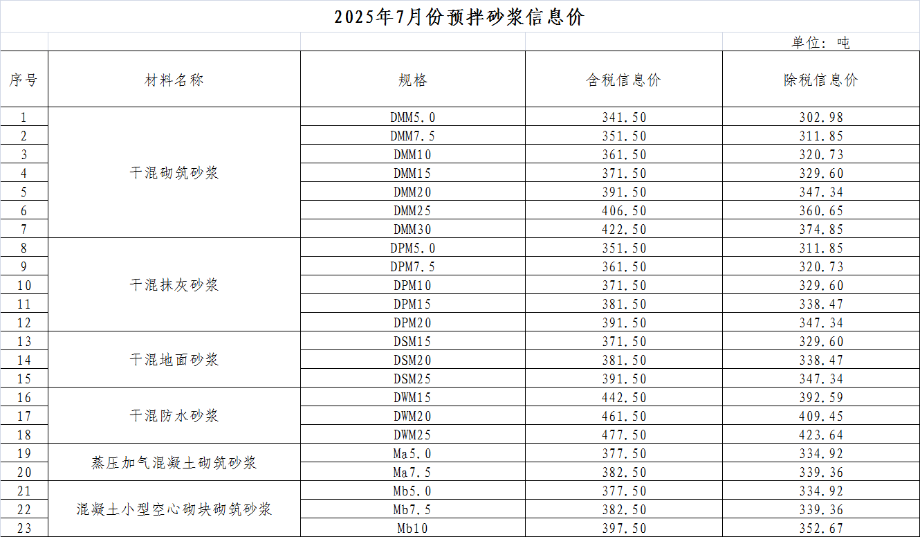 2025年7月份預(yù)拌砂漿信息價(jià)