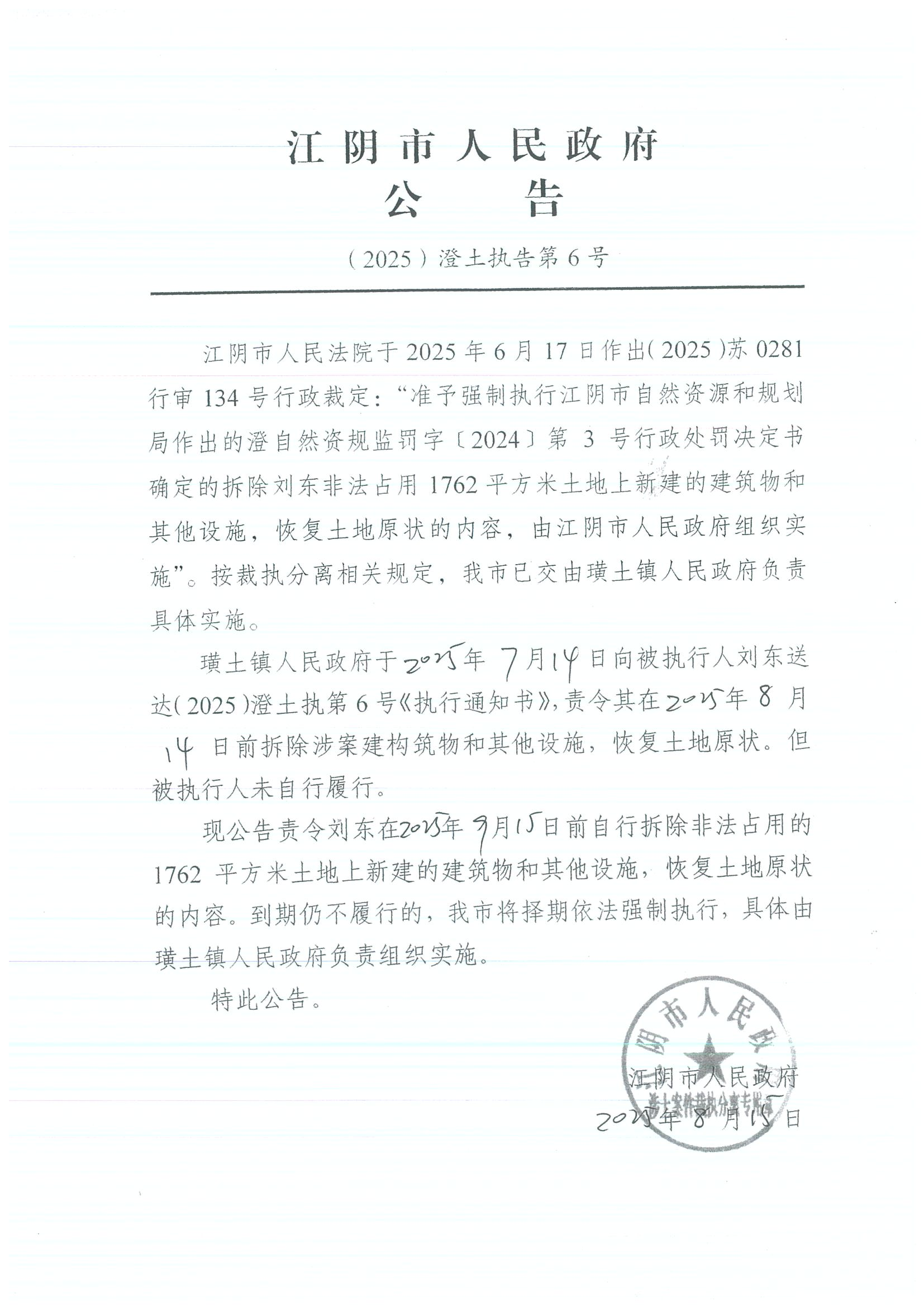 | 內(nèi)容概述 | 江陰市人民政府公告(2025)澄土執(zhí)告第6號 | ||||