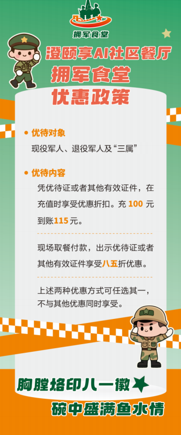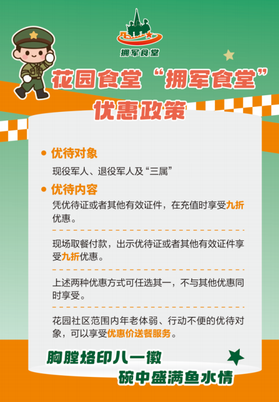 “擁軍食堂”面向現(xiàn)役軍人、退役軍人和“三屬”開放,憑相關(guān)證件可享受餐飲折扣優(yōu)惠。