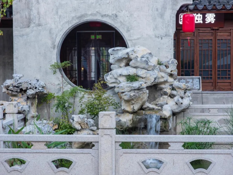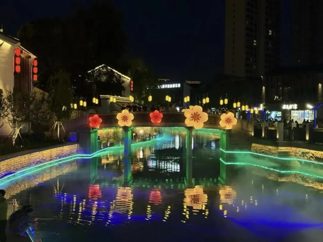 我們疊石成山、引水為瀑,用自然點(diǎn)綴街巷;街邊花箱與陶缸植叢,融合了藝術(shù)與生活;同時(shí)精選香樟、烏桕等鄉(xiāng)土樹種,通過組合造景與單點(diǎn)點(diǎn)綴,營(yíng)造出靈動(dòng)景觀。夜幕降臨,瓦楞燈、洗墻燈、燈籠照亮街巷,河邊射燈與霧森系統(tǒng)交織成光影夢(mèng)幻,帶來獨(dú)特夜游體驗(yàn)。