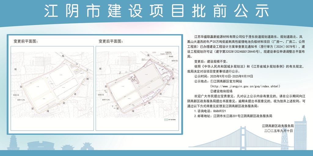 江蘇華盛聯(lián)贏新能源材料有限公司的年產(chǎn)20萬噸低能耗高性能鋰電池負極材料項目(廠房一、廠房二、公用工程房)方案變更批前公示
