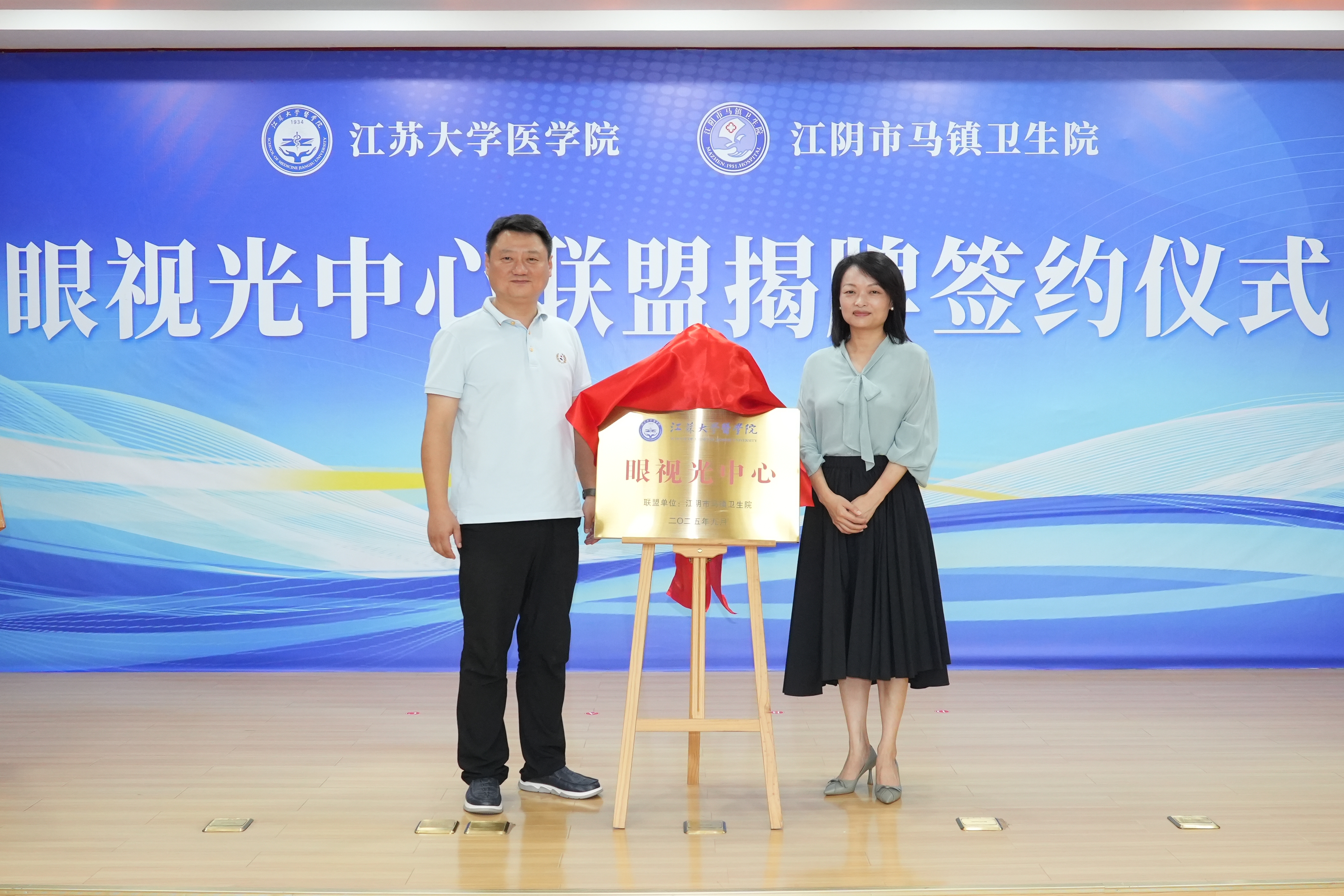 ▲江蘇大學(xué)醫(yī)學(xué)院黨委書(shū)記邱健與江陰市衛(wèi)生健康委黨委書(shū)記、主任胡瑩潔共同為“江蘇大學(xué)醫(yī)學(xué)院 江陰市馬鎮(zhèn)衛(wèi)生院眼視光中心聯(lián)盟”揭牌。