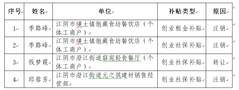 根據(jù)《關(guān)于進(jìn)一步明確創(chuàng)業(yè)扶持資金申領(lǐng)審核有關(guān)問題的通知》(澄人社〔2021〕24號)文件規(guī)定,我單位在創(chuàng)業(yè)補(bǔ)貼后續(xù)監(jiān)管過程中,發(fā)現(xiàn)部分申請對象存在不符合補(bǔ)貼發(fā)放條件的情形。為保障政策執(zhí)行的嚴(yán)肅性和公平性,現(xiàn)將結(jié)算期為2025年4月至2025年6月間的創(chuàng)業(yè)補(bǔ)貼取消發(fā)放名單予以公示。