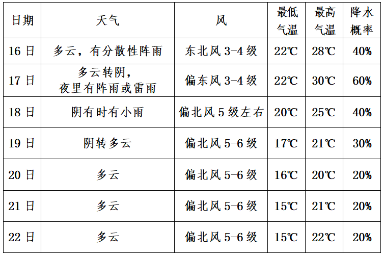 據(jù)最新氣象資料顯示,未來三天我市仍多陣雨天氣,19日起天氣轉好,以多云天氣為主。16-17日副高再次增強,預計我市氣溫將有所回升,17日最高氣溫升至30℃左右;17日夜里起將有一次冷空氣過程,受其南下影響,我市將有一次大風降溫過程,18-22日偏北風力較大,最高氣溫降至21℃左右。