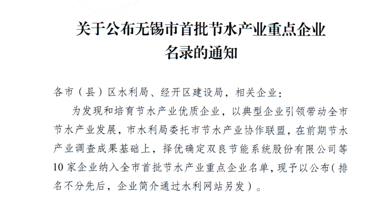 壯大節(jié)水產(chǎn)業(yè),不僅是保障城市水安全的“壓艙石”,更是推動(dòng)綠色低碳發(fā)展的“新引擎”。為發(fā)現(xiàn)和培育節(jié)水產(chǎn)業(yè)優(yōu)質(zhì)企業(yè),以典型企業(yè)引領(lǐng)帶動(dòng)全市節(jié)水產(chǎn)業(yè)發(fā)展,近日,無錫市公布首批節(jié)水產(chǎn)業(yè)重點(diǎn)企業(yè)名錄(10家),雙良節(jié)能系統(tǒng)股份有限公司作為江陰市唯一一家上榜企業(yè)名列其中。