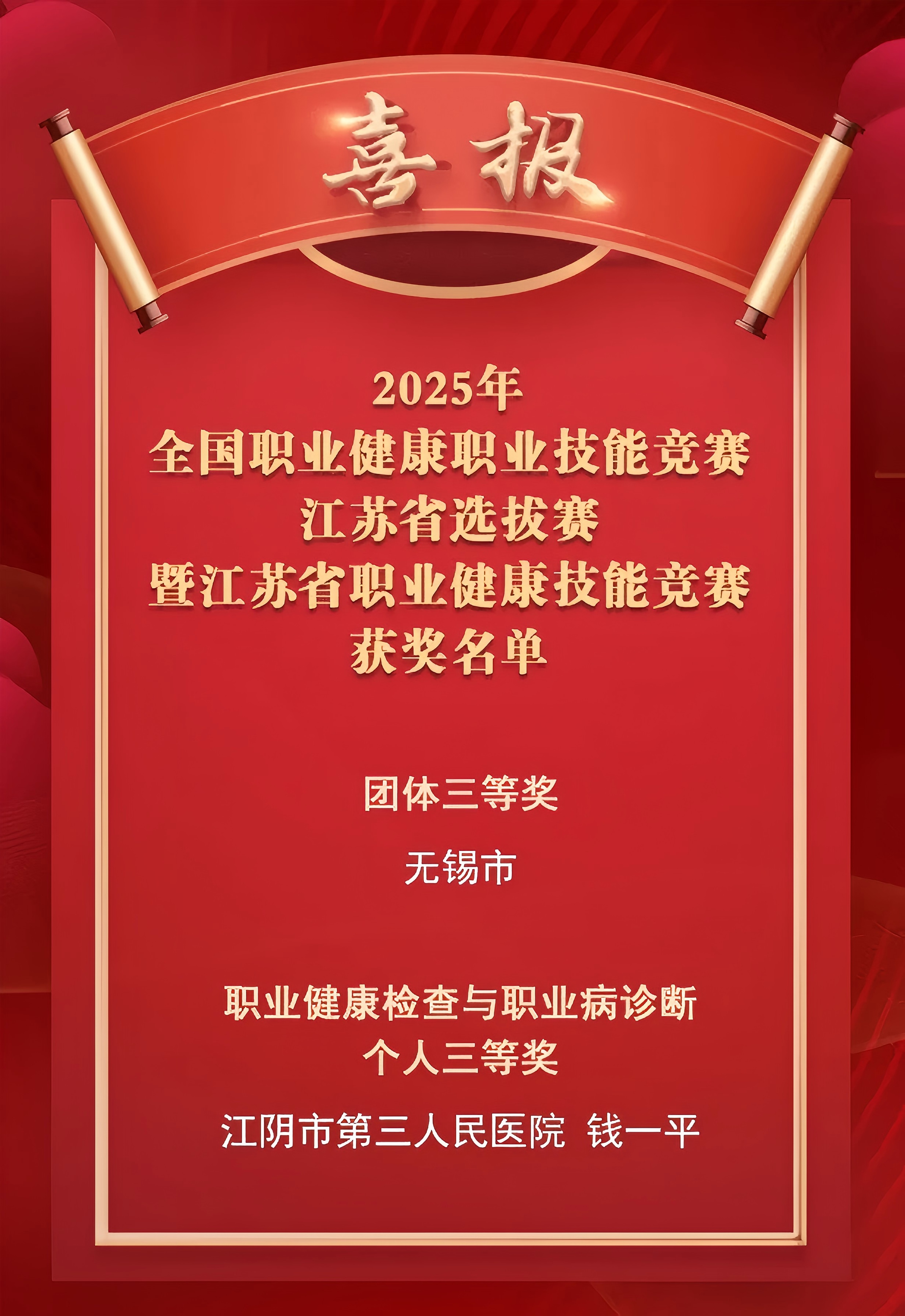 在省衛(wèi)生健康委員會、省委省級機(jī)關(guān)工委、省總工會舉辦的2025年全國職業(yè)健康職業(yè)技能競賽江蘇省選拔賽暨江蘇省職業(yè)健康技能競賽中,江陰市第三人民醫(yī)院錢一平榮獲職業(yè)健康檢查與職業(yè)病診斷個人三等獎,無錫市代表隊(duì)榮獲團(tuán)體三等獎。