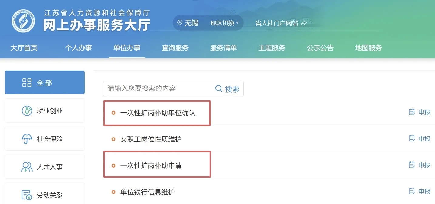 人社部門(mén)提醒,如果您的企業(yè)符合條件但是沒(méi)收到確認(rèn)信息的,也可以線上申請(qǐng):通過(guò)登錄“江蘇人社網(wǎng)上辦事服務(wù)大廳”,點(diǎn)擊“單位辦事”,找到“一次性擴(kuò)崗補(bǔ)助申請(qǐng)”就可以線上辦理了。