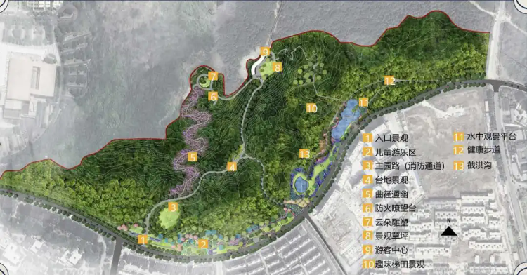 堅(jiān)持“尊重自然、順應(yīng)自然”的改造原則,以山體自然形態(tài)為項(xiàng)目建設(shè)基底,在不改變耙齒山基本格局的前提下,充分銜接原有地形地貌和植被分布,以消防通道為脈絡(luò)構(gòu)建交通網(wǎng)絡(luò),打造“擬合山體、融于自然”的登山步道與景觀節(jié)點(diǎn),讓人工設(shè)施與原生態(tài)山體無(wú)縫銜接。